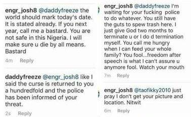 These comments led to the US-based Instagram user, engr_josh to come at Freeze in the most extreme way imaginable, threatening to kill him if God hasn’t already ‘terminated’ him in the next two months.