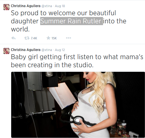 First was ‘Blue Ivy‘ by Jay Z and Beyonce, then ‘North West‘ by Kanye West and Kim Kardashian followed. Now, 33 year old pop star Christina Aguilera who welcomed her daughter on Sunday August 16 with her boo Matther Rutler has revealed the name of their daughter to be ‘Summer Rain Rutler’.