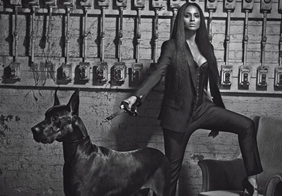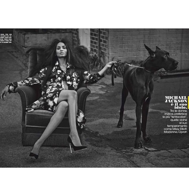 Holding a big dog on a leash in the shoot, she rocked a wild hair and a Gucci trench coat while clad head-to-toe in Givenchy. She also seduces in an Agent Provocateur slip and silky Valentino pantsuit.