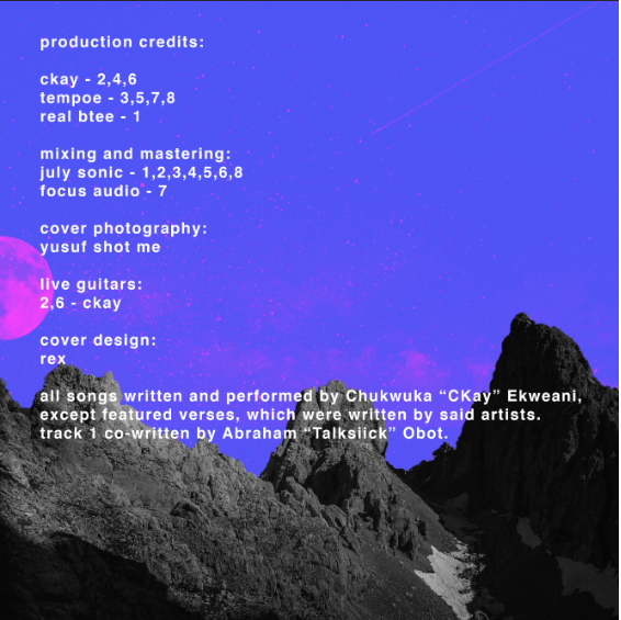 The EP’s lead single, ‘Way’, is a cheeky interpolation of Beethoven’s 5th Symphony, showing off Ckay’s prowess as a producer. ‘Ckay The First’ is a blend of musical genres and influences, from heavy dance numbers like ‘Ski Ski’, to the seductive R&B sounds of ‘DTF’, and ‘Kalakuta’, inspired by Afrobeat pioneer Fela Anikulapo-Kuti.