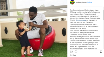 THE SUDDEN DEATH OF LITTLE DANIELThe Commissioner of Police, Lagos State, CP Edgal Imohimi, on behalf of officers and men of Lagos State Police Command, wishes to commiserate with the family of Mr and Mrs Oladapo Daniel Oyebanjo a.k.a D’BANJ @iambangalee on the death of their one year old son, Daniel(Jnr) Oyebanjo whose sad event took place yesterday 24/06/2018, at the Ikoyi-Lagos residence of the family.