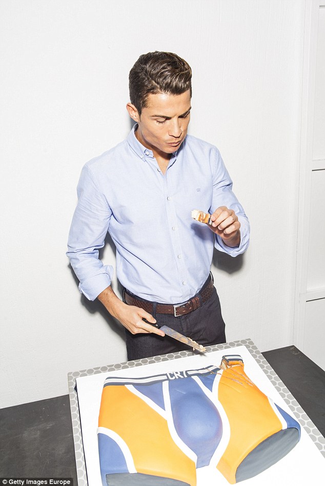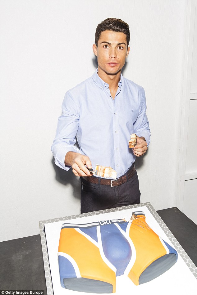The striker, who is currently the highest goal scorer in Spanish La Liga, was pictured celebrating the anniversary by cutting a cake which has the shape of his underwear brand launched a year ago.