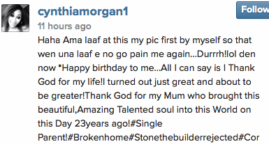 Writing further in the long post, she said: ‘Happy birthday to me…All I can say is I Thank God for my life!I turned out just great and about to be greater!Thank God for my Mum who brought this beautiful, Amazing Talented soul into this World.