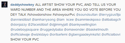 According to him: ‘All artist show your pvc, and tell us your ward number and the area where you go vote before you dey talk #showdonshow #showyourPvc.’
