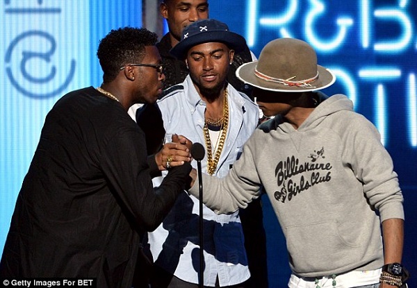 The English striker presented the Best Male R&B/Pop Artist award to singer-songwriter Pharrell Williams alongside NFL star DeSean Jackson and actor Boris Kodjoe in Los Angeles.