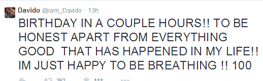 In a pre-birthday post on his Twitter page, Davido wrote: ‘Birthday in a couple hours!! To be honest apart from everything good that has happened in my life!! I’m just happy to be breathing!.’