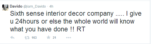 The singer angrily took to his Twitter handle to write: ‘Sixth sense interior decor company ….. I give u 24hours or else the whole world will know what you have done.’