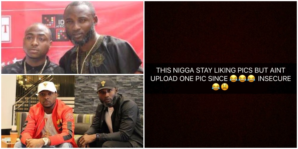 ‘This nigga stay liking my pics but ain’t upload a pic since, insecure,’ Davido shared on Snapchat with tears of joy emojis.