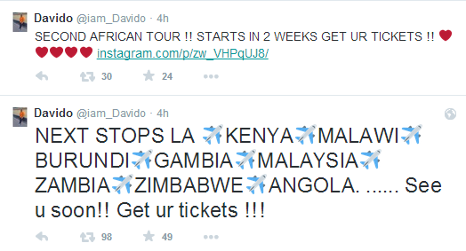 Davido made the announcement today on Twitter to the delight of his fans when he wrote: Second African Tour!! Starts in 2 weeks get ur tickets!!