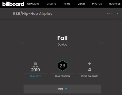 Davido’s 2017 hit, Fall continues to do impressive numbers. The song whose video currently holds the record for the most streamed Nigerian music video on YouTube has now also become the longest charting Nigerian song on Billboard.