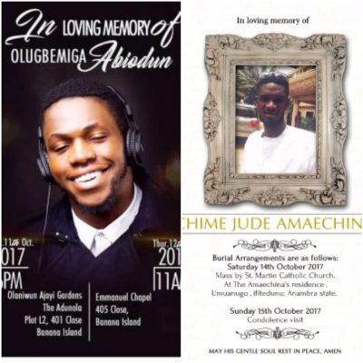 Just about a week after their mysterious deaths, the pair of Davido’s friends Olugbemiga ‘DJ Olu’ Abiodun and Chime Amaechi are set to be buried on Thursday and Saturday respectively.