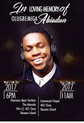 A wake was done for DJ Olu on Wednesday 11th October close to his home in Banana Island and he will be interred later today Thursday 12th.