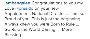 Kokomaster D’banj has just sent a congratulatory message to his ‘Love’ Adama Indimi who has just been appointed as a Director for Grassroot Mobilizers for Buhari.
