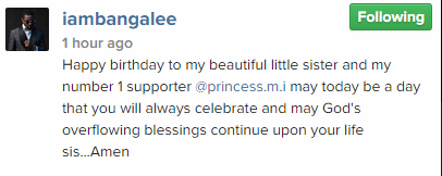 Not only that, the music star also didn’t forget to post another message, this time about Adama’s kid sister, Meram Indimi, who clocks 25 today. He took to the picture-sharing social media site to wish her a happy birthday, describing her as his ‘beautiful, little sister and my number 1 supporter.’