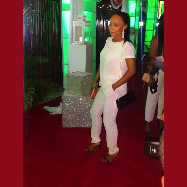 The media personality wore a white top and pant, she accessorised with a black velvet purse with chain hand and strap heel sandals to match.