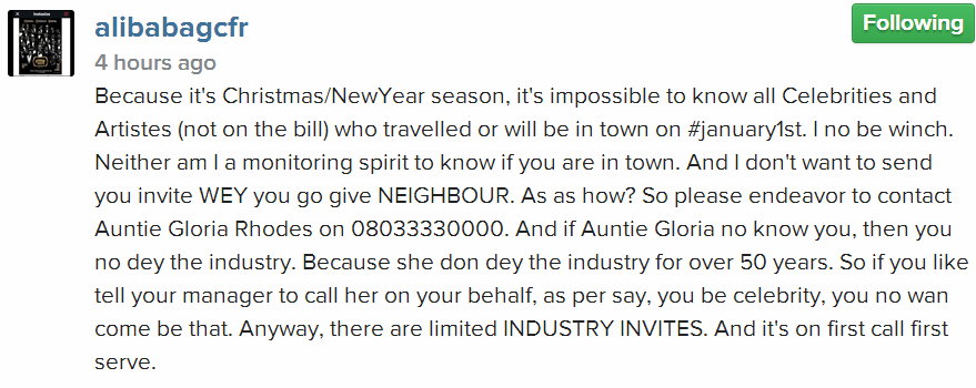 ‘Because it’s Christmas/NewYear season, it’s impossible to know all Celebrities and Artistes (not on the bill) who travelled or will be in town on #january1st. I no be winch. Neither am I a monitoring spirit to know if you are in town. And I don’t want to send you invite WEY you go give NEIGHBOUR. As as how? So please endeavor to contact Auntie Gloria Rhodes on 08033330000. And if Auntie Gloria no know you, then you no dey the industry. Because she don dey the industry for over 50 years. So if you like tell your manager to call her on your behalf, as per say, you be celebrity, you no wan come be that. Anyway, there are limited INDUSTRY INVITES. And it’s on first call first serve.’