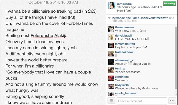 Dencia, known for her skin lightening product, Whitenicious, took to her Instagram page on Saturday, October 18, 2014 to share a post in which she modified the lyrics to the famous Travie McCoy song ‘I wanna be a billionaire,’ saying she wants to be on cover of the Forbes/Times magazine with Nigerian businesswoman Folorunsho Alakija, who was ranked by Forbes as the 96th most powerful woman in the world and the richest woman in Nigeria, with an estimated net worth of $2.5 billion as of 2014.