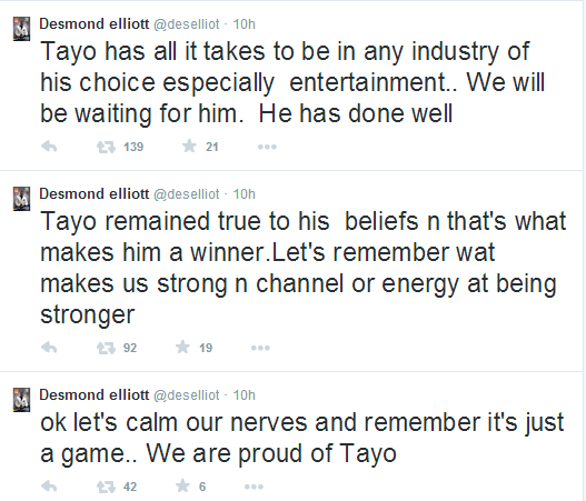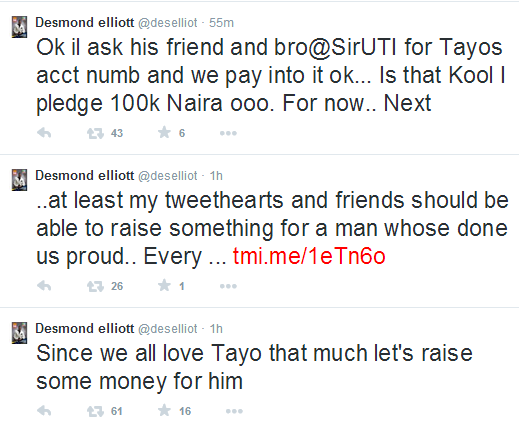 He went on to launch a Twitter campaign to raise funds for Tayo since he lost the $300,000 prize money saying, ‘Since we all love Tayo that much let’s raise some money for him. Ok il’l ask his friend and bro Uti for Tayo’s acct numb and we pay into it ok… Is that Kool I pledge 100k Naira ooo. For now.’