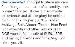 Desmond, who now represents the Surulere Constituency at the Lagos State House of Assembly, also gave a huge shout out to former Lagos governor and APC leader, Bola Tinubu and other party leaders for their support.