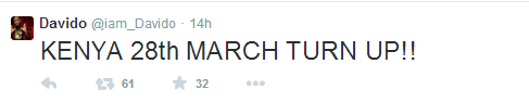 Davido’s tweet reads: ‘Kenya 28th March Turn Up!!’ and NET gathered the singer will be headlining the Afrobeatz Festival scheduled to hold on March 28, 2015 at the Carnivore Grounds in Nairobi, Kenya with OAP, Shaffie Weru as host.