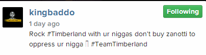 A few days ago, pop star, Wizkid shared pictures of his newly acquired Guiseppe Zannoti sneakers on Instagram and just a few days later, November 16, 2014 to be precise, Olamide shared his own picture below with the caption: ‘Rock #Timberland with your niggas don’t buy zanotti to oppress your nigga #TeamTimberland.’