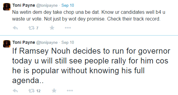Toni Payne wants you to check the track record of the people you would vote for before ‘wasting your votes’, in her words, ‘Na wetin dem dey take chop una be dat. Know your candidates well before you waste your vote. Not just by what they promise. Check their track record’, she went on to add that, ‘If Ramsey Nouah decides to run for governor today you will still see people rally for him because he is popular without knowing his full agenda.’