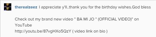 The artiste who also used the opportunity to create awareness for his new music video, wrote: ‘I appreciate y’ll..thank you for the birthday wishes. God bless. Check out my brand new video ‘BA MI JO’ (OFFICIAL VIDEO)’ on YouTube http://youtu.be/87vgHXo5QzY ( video link on bio )’