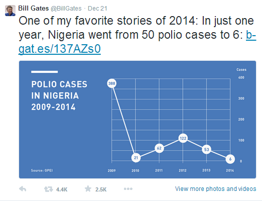 In a recent tweet from his verified twitter account, Bill Gates wrote: ‘One of my favorite stories of 2014: In just one year, Nigeria went from 50 polio cases to 6.’