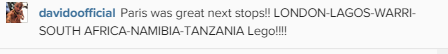 Both stars have headlined sold out concerts in several parts of the world in the year 2014 and they do not seem to be stopping anytime soon. For Davido, he just finished a string of concerts in Germany, London and Paris, and he’s just revealed his next locations in a tweet where he wrote, ‘Paris was great next stops!! LONDON-LAGOS-WARRI-SOUTH AFRICA-NAMIBIA-TANZANIA Lego’.