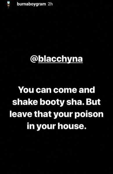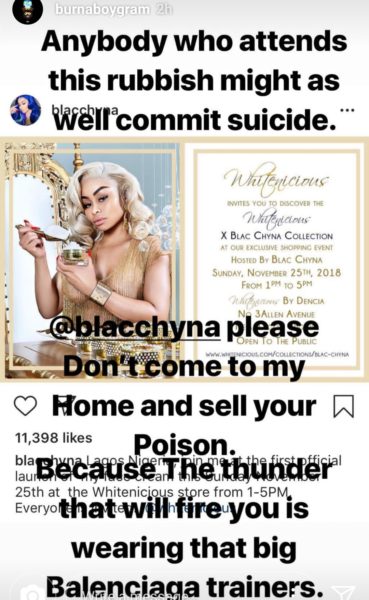 Whitenicous is a body lotion which apparently lightens the skin of its users and Burna Boy in a series of posts shared on his IG stories has asked Blac Chyna not to bring her ‘Poison’ to his home country Nigeria. The singer also warned that anyone who attends the event of perhaps patronizes the product might as well commit suicide.