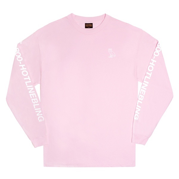 The pink shirt has the OVO owl on the left corner and the words ‘1-800-HOTLINEBLING’ purposefully screenprinted on the sleeves.