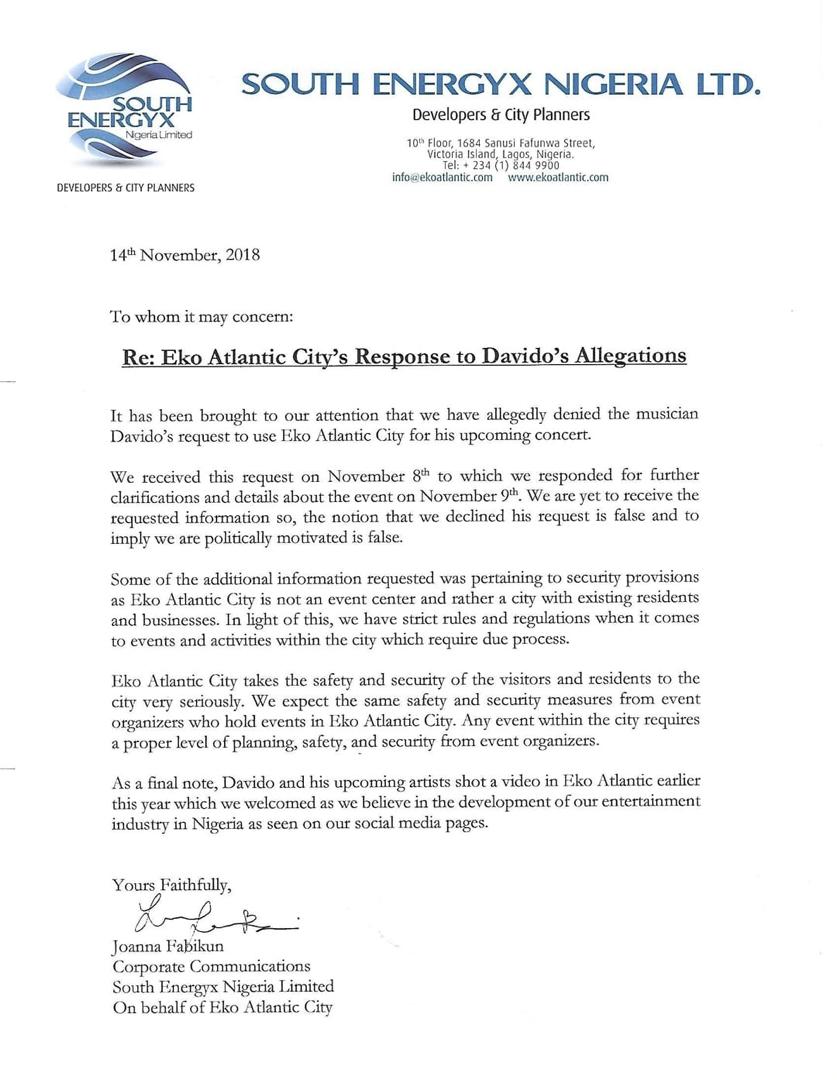 Fabikun in her statement said Davido made his request to use Eko Atlantic City on the 8th of November, which they replied on the 9th, requesting for more information with regards to security arraangements and other information from the music star. She also said that the singer was yet to get back to them on the information requested from him.