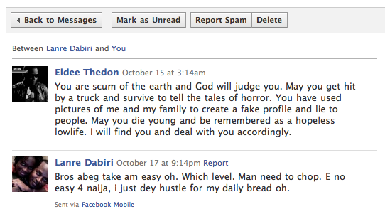 WOW….. TO THE IMPERSONATOR, NOW THATS TOO MUCH AND UVE GONE OVER BOARD. FOR ELDEE, SORRY ABT THT, THATS WHT HAPPENS WHEN U FAMOUS, PEOPLE WANNA BE U. IMPERSONATOR GUY, HOPE SAY THE ELDEE FOR MY FACEBOOK, NA THE REAL ELDEE. WILL THE REAL ELDEE PLS STAND UP!!!!!!!!!!!!!!!!!!!!!!!!!!!