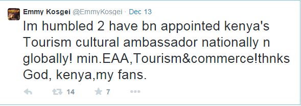 ‘Im humbled 2 have bn appointed Kenya’s Tourism cultural ambassador nationally n globally! min.EAA, Tourism&commerce!thnks God, kenya,my fans.’
