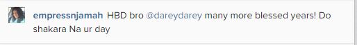 Empress posted a picture of the R&B singer with the caption: ‘HBD bro @dareydarey many more blessed years! Do shakara Na ur day’.