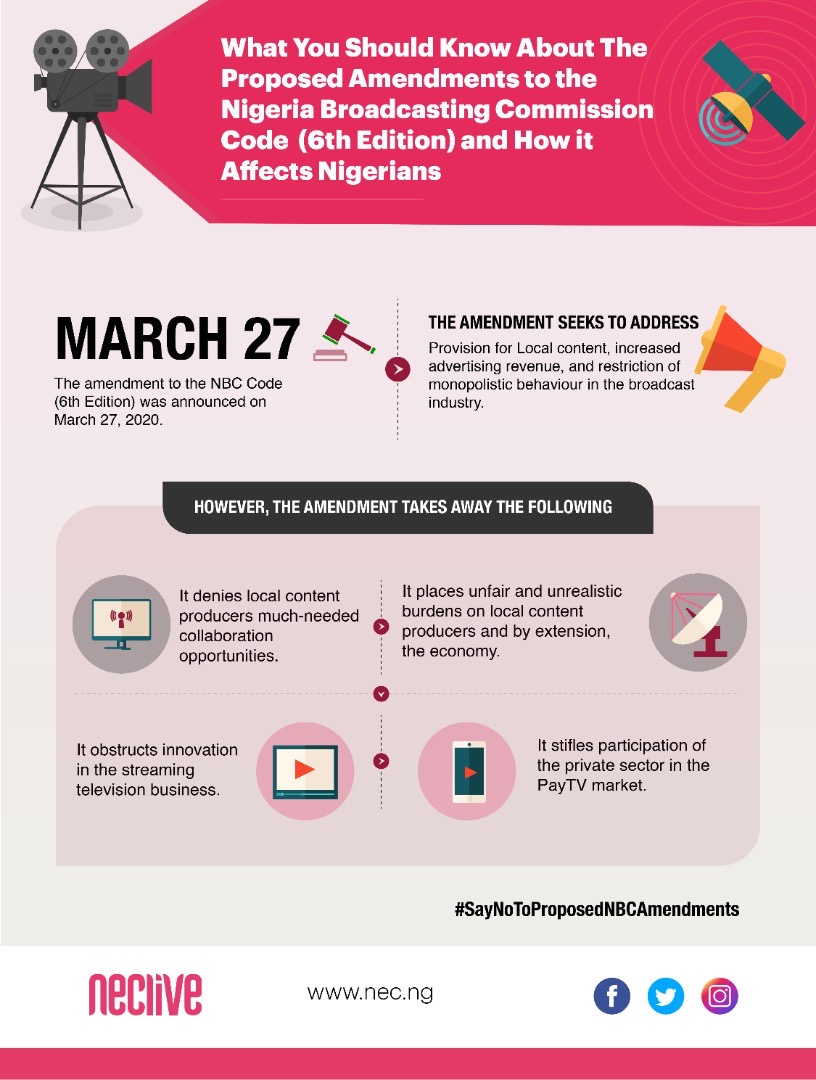 On March 27, 2020, the National Broadcasting Commission of Nigeria (NBC) announced amendments to the the 6th edition of the Nigeria Broadcasting Code.