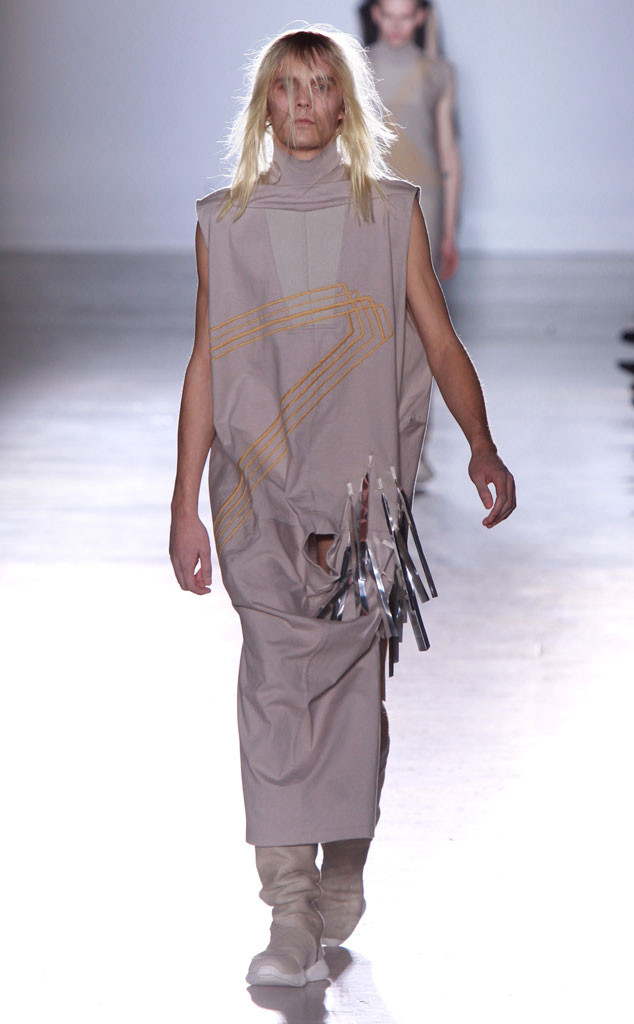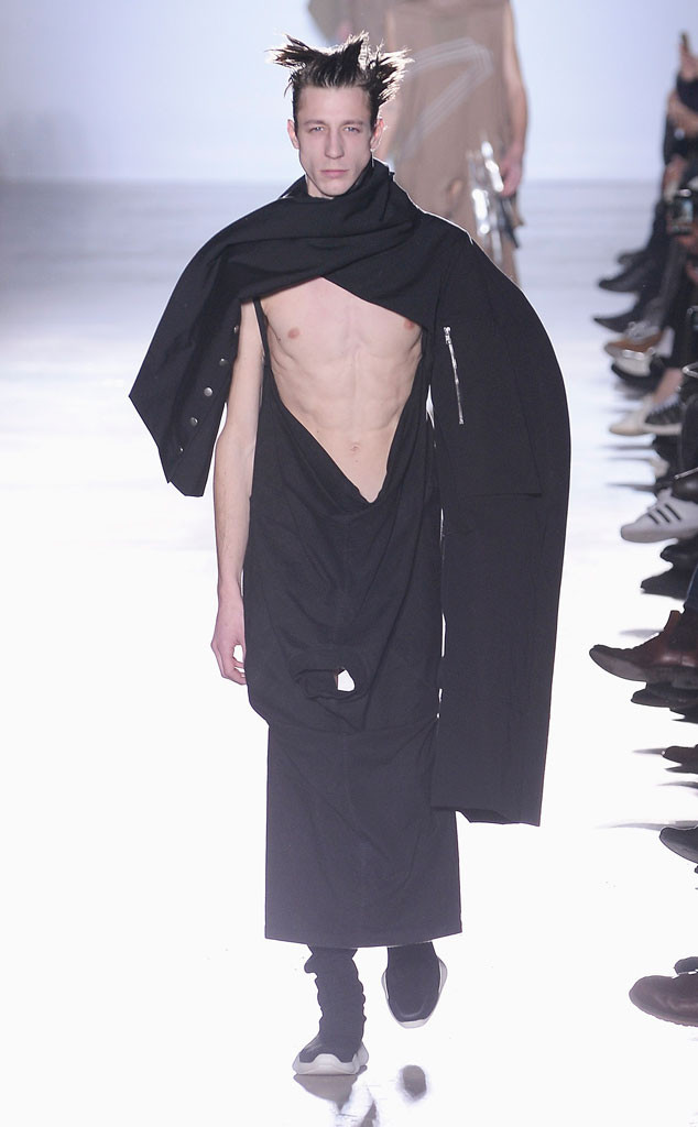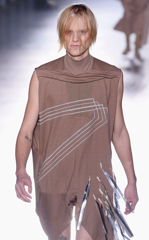 A model wore the penis-baring poncho-dress-type garment with an intentionally cut out hemline that gave fans in the audience a clear view of his package.