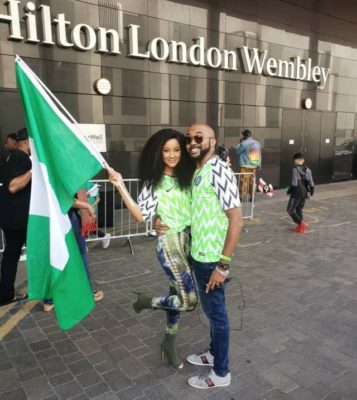 Banky and Adesua coupled up wearing their jersey. Banky paired his with jeans and Gucci sneakers, Adesua paired hers with tie-dyed green and blue jeans and green heels. The things we would do just to be the flag they were holding. Even though it’s cheating, they get 10/10 and 2 crates of Star Lager (limited edition bottle 😉)