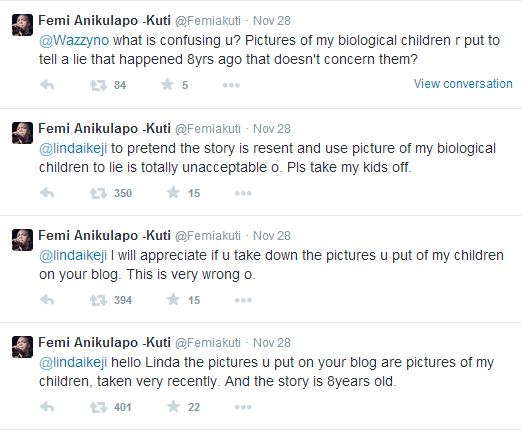 Specifically calling out Linda Ikeji from whose stable the report emanated, the Grammy Nominee continued: ‘She put children that r my biological in pretext of the story, that’s 8yrs old & I didn’t talk about. The pics put up are pics of my biological children to pretend the story happened like yesterday. The pictures you put on your blog are pictures of my children, taken very recently. And the story is 8years old. I will appreciate if u take down the pictures you put of my children on your blog. This is very wrong. To pretend the story is recent and use picture of my biological children to lie is totally unacceptable o. Please take my kids off.’