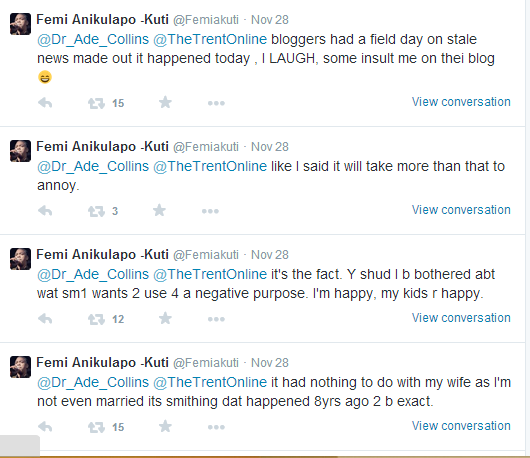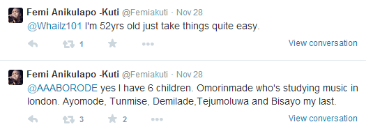 While disclosed that his management will take the issue up from the original source in a series of tweets, Femi Kuti said ‘I live with my children and those that know me know how much I love them. It’s someone trying to be mischievous because they know the love I have for my children and are trying hurt me. I’m 52 years old and I have 6 children Omorinmade who’s studying music in London, Ayomode, Tunmise, Demilade, Tejumoluwa and Bisayo my last.’