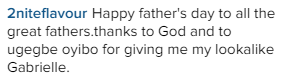 In his post today, Flavour thanked his babymama, Sandra Okagbue for giving him a pretty daughter that looks very much like him. Gabrielle was born on September 28, 2014 in the United States of America.