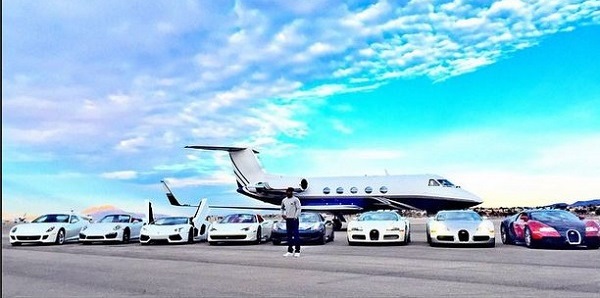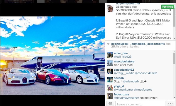 The American professional boxer who first showed three Bugattis, 3 Ferraris, one Lamborghini, one Porsche car and a private jet earlier this week, took to his Instagram account today, January 8, 2015 to disclose the prize of the Bugattis.