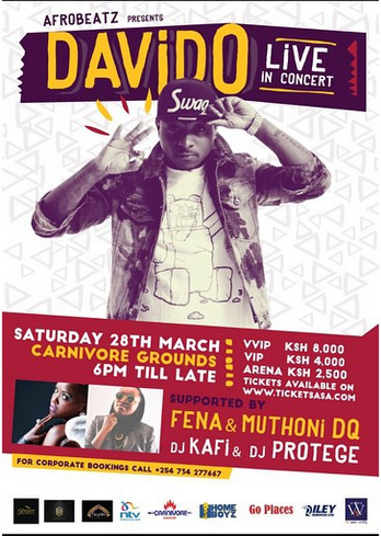 Davido, who is currently in New York, has been announced as the headliner of the Afrobeat concert in Kenya at the Carnivore Grounds on Saturday, March 28, 2015 alongside Fena, Muthoni DQ, DJ Kafi, and DJ Protege.