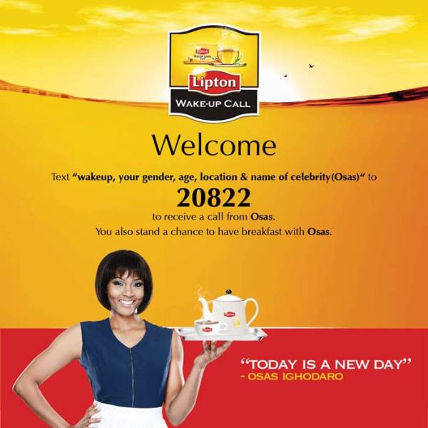 All you need to do? Text ‘Wake up, your gender, age, location and name of celebrity (Osas)’ to 20822 and get a call from the lovely Osas or any your favourite Lipton Tea celebrity!