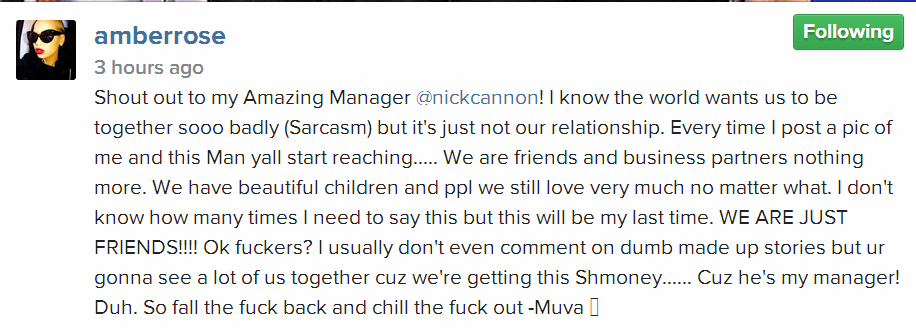 Just a few minutes after sharing photos on Instagram announcing she and Nick Cannon now have matching Ferraris, Amber Rose has taken further pains to clear the air on her alleged romance with Mariah Carey‘s former husband.