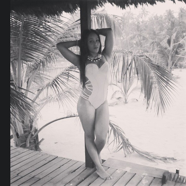 The singer, who is presently on vacation, posted these pictures, wearing an orange swimsuit and sunglasses, and ermm…necklaces?