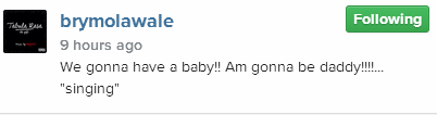 Brymo, who released his 4th studio album, Tabula Rasa in October 2014, made the announcement a few hours ago on Instagram when he shared pictures of his pregnant boo with the caption: ‘We gonna have a baby!! Am gonna be daddy!!!!… Singing’.