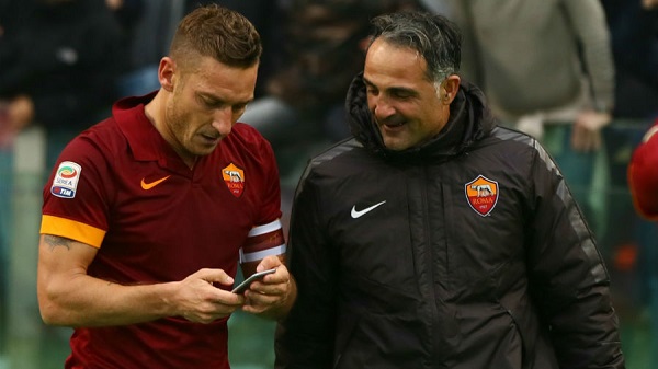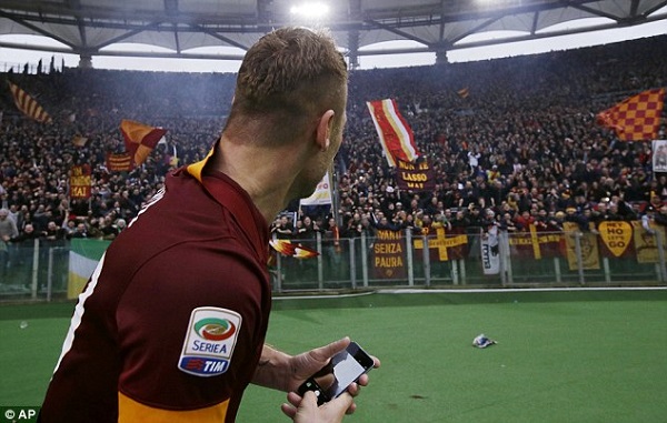 To celebrate his second goal after he equalled the 11 goals of former Italy and Roma legend, Dino Da Costa in the history of the Rome Derby, Totti ran to one of the coaching staff to collect an iphone 6.