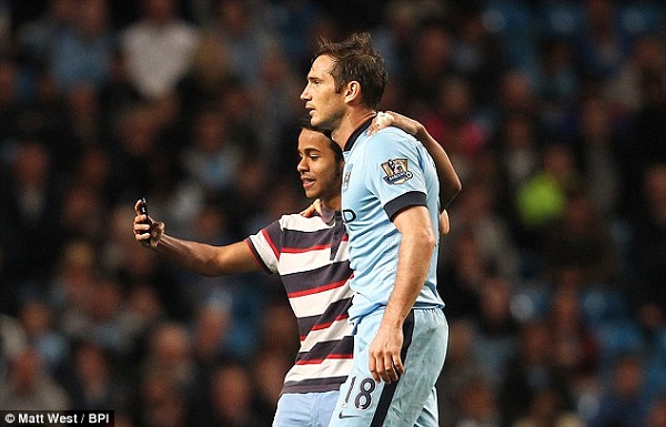 A daring young supporter invaded the football pitch in a Capital One cup match between Manchester City and Sheffield Wednesday to take a selfie with ex-chelsea midfielder, Frank Lampard.