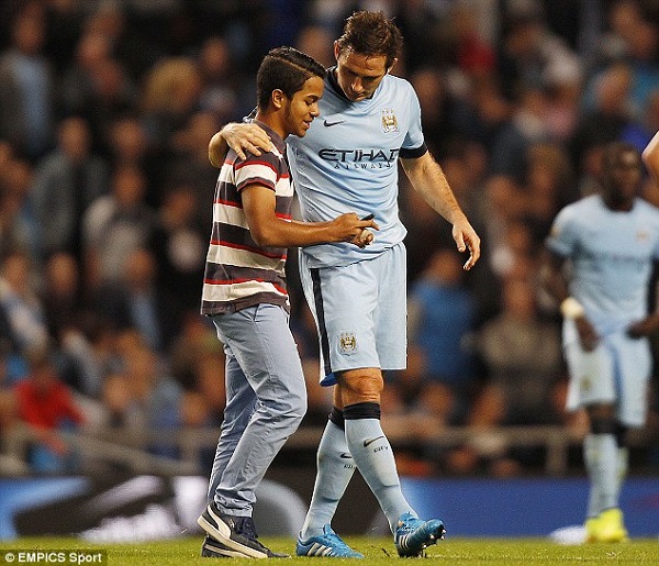 With few mintes left to the end of the game, the passionate fan evaded security and ran on to the field to hug Lampard, who had 2 goals in the 7nil rout of Sheffield Wednesday, and the fan persuaded him to pose for a photograph.